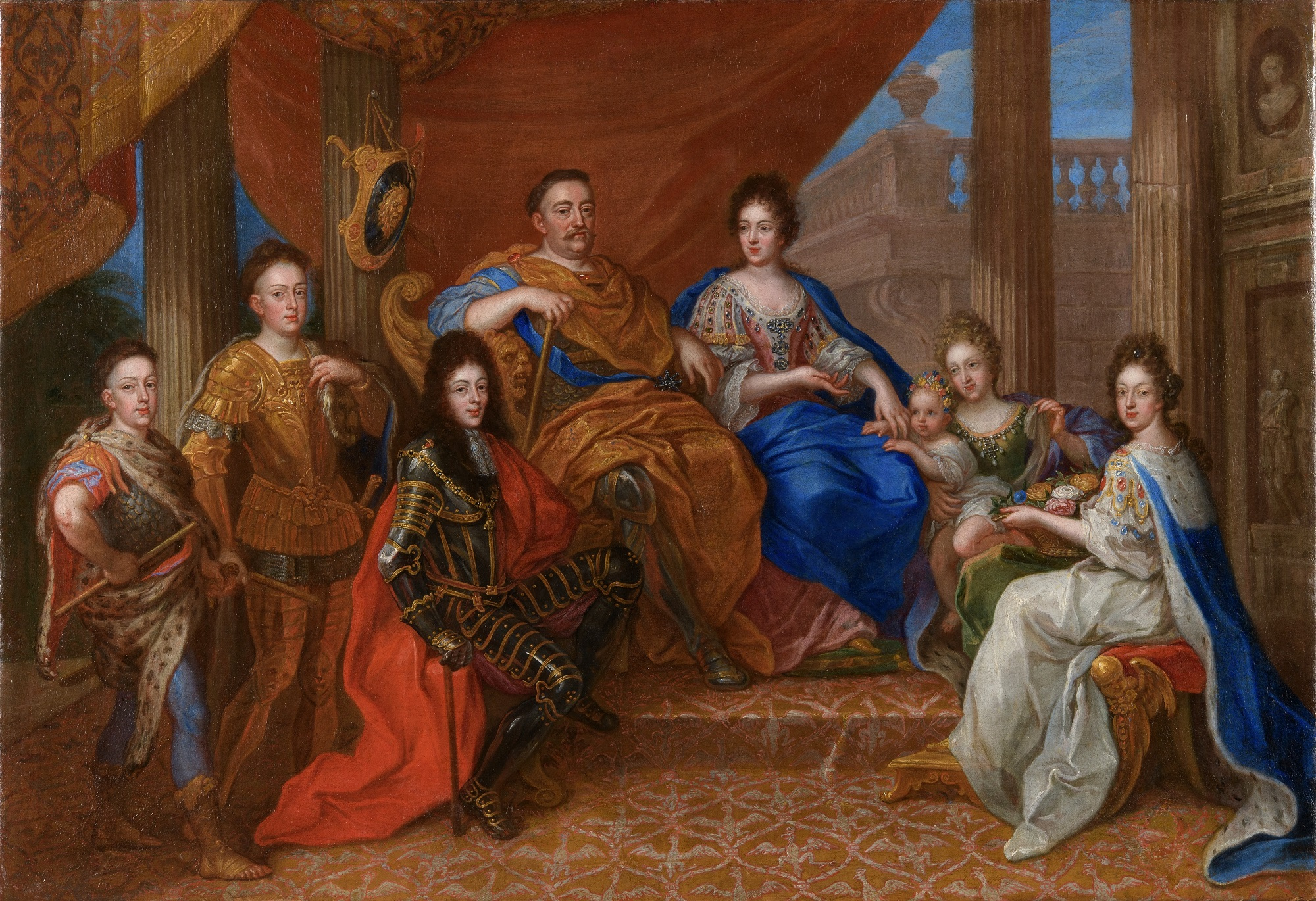 The group portrait depicts the Sobieski family: King Jan III (1629-1696), Queen Marie Casimire (1641-1716), eldest Prince Jakub Ludwik (1667-1737), younger sons Aleksander Benedykt (1677-1714) and Konstanty Władysław (1680-1726), daughter Teresa Kunegunda (1676-1730), Hedwig Elisabeth Amalia von Pfalz-Neuburg (1673-1722), wife of James and their daughter Maria Leopoldina. It is a work of small size, but with a strongly representative character exposing the dynastic plans of the Sobieski family, which were implemented with great intensity, especially in the years following the 1683 victory of the Vienna battle.